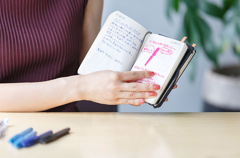 いつも肌身離さず持っているアイデアノートを拝見すると、やはりピンクで書かれた文字があちらこちらに。ピンクのサインペンから生み出されたアイデアやイラストは可愛いというよりむしろエネルギッシュ。見ているだけでワクワクします。