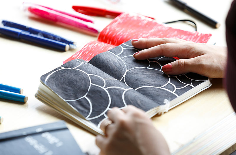 ピンクのサインペンとの出合いをきっかけに自分の中でサインペンの大ブームが来たと話しながら、菅さんが懐かしそうにノートをめくると、今度は黒のサインペンで塗りつぶされたページが現れます。