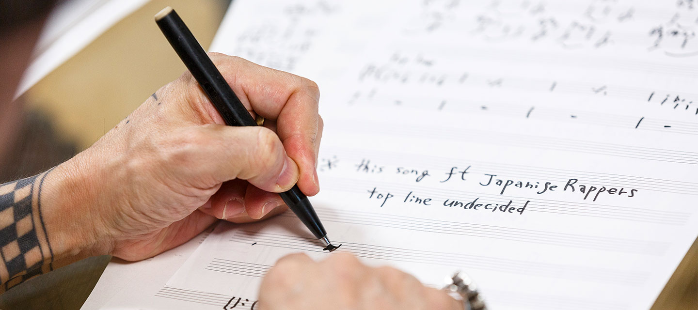 「僕は五線譜にもぺんてるで書くんだけど、やっぱりリズムが大事。気分がノッてきた時にシャーペンみたいにポキポキと芯が折れたり、ボールペンみたいに角度や紙によって書けなくなったりするのは、もうあり得ない。一方ぺんてるは、ノッてきた僕を邪魔しない。輪郭もパキッと明確だし、いいビートを刻んでくれる。書きなおす時はバンバン五線譜を捨てて、10枚目ぐらいで完成するんだけど、ぺんてるだけで書き上げたという、妙な満足感があるのもなんかいいんですよ。あと書いてない時、僕の指が何をしているかというと、こうやって大体ぺんてるに挟まっているんですよ。これをペンペンと弾いたり、ぐにゃぐにゃっともてあそんだり。末端に刺激がないと落ち着かないのは大人になっていない証らしいけどね(笑)。」
